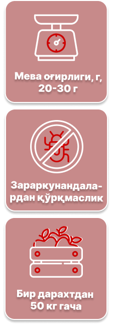 "Гилос "Гигант РЭД" қурғоқчилик ва зараркунандаларга қарши мукаммал чидамлилигини кўрсатади, бу бизнинг боғбонларимиз учун ажралмас ҳисобланади. Катта меваси ва кечки пишиб етиши туфайли у узоқ муддатли ҳосилни таъминлайди, ғамхўрликда оддий бўлиб қолади", дейди мутахассис.