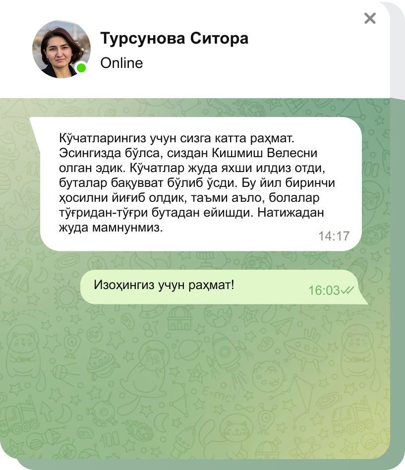 Кўчатлар узумзорингизнинг соғлом бошланишини таъминлаш учун меҳр ва ғамхўрлик билан парвариш қилинади.